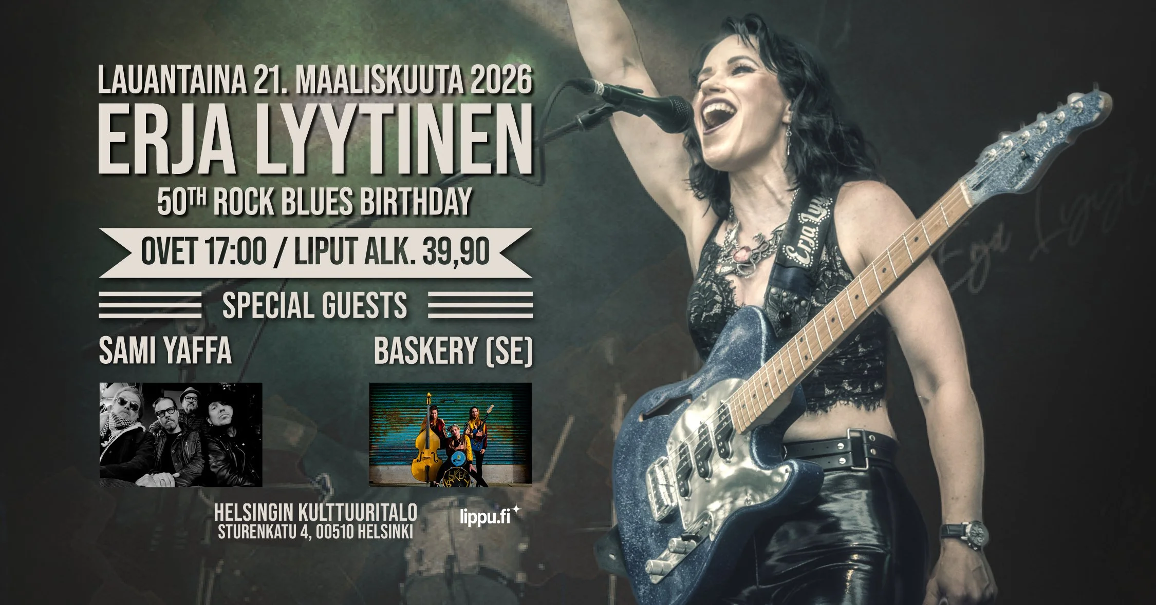 "It was clear that I would be celebrating my 50th birthday in Finland with great musicians and friends! The evening is going to be quite a musical fireworks show in the field of rock and roots, as Sami Yaffa and Baskery are both amazing, mind-blowing performers. Do not miss this evening!, says Lyytinen about her birthday party.